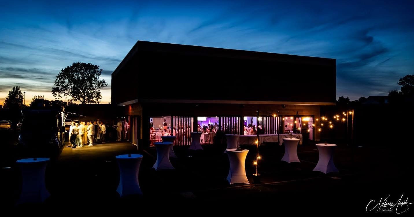 Pour la partie vin d’honneur c’est un ensemble de poteaux en bois avec guirlandes suspendu afin d’obtenir sur un rendu chaleureux !