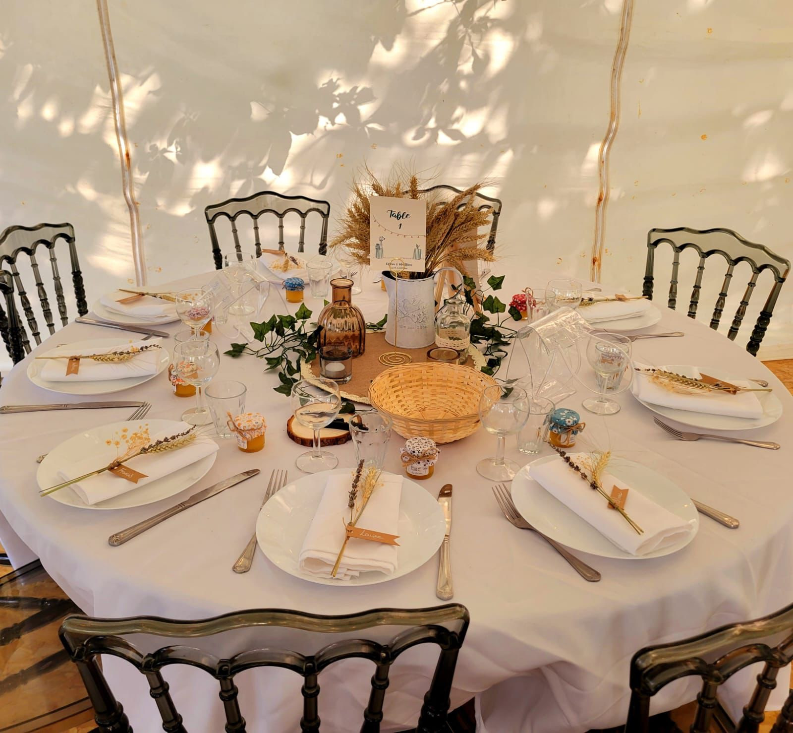 Pour couvrir une cinquantaine d’invités nos clients ont opté pour une tente de réception de 72m2 aux parois à l’italienne sur un plancher bois pour un confort optimal. Le choix du mobilier s’est dirigé vers un style champêtre avec un éclairage en guirlande jaune pour une soirée chaleureuse , des jeux de lumière et une enceinte de 700 Watts pour animer la soirée dansante.
